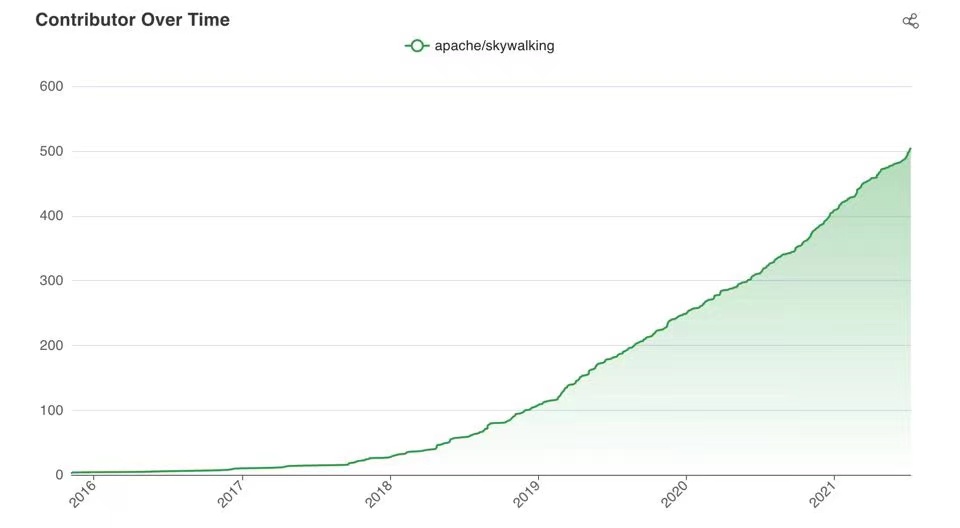 SkyWalking has over 500 contributors based on GitHub repository statistics. This is a remarkable achievement for the whole diverse community.