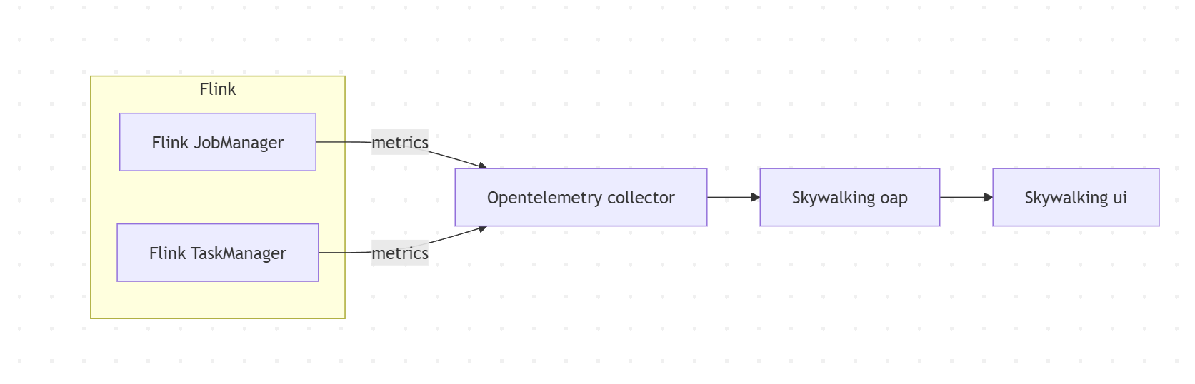 Since SkyWalking 10.3, a new out-of-the-box feature has been introduced that enables Flink monitoring data to be visualized on the SkyWalking UI via the OpenTelemetry Collector, which gathers metrics from Flink endpoints.