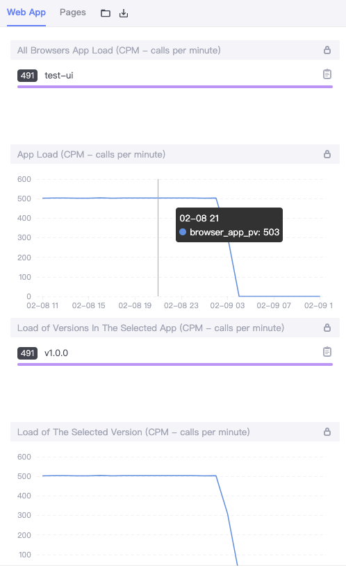 • App JS Error Rate, the proportion of PV with JS errors in a selected time period to total PV.